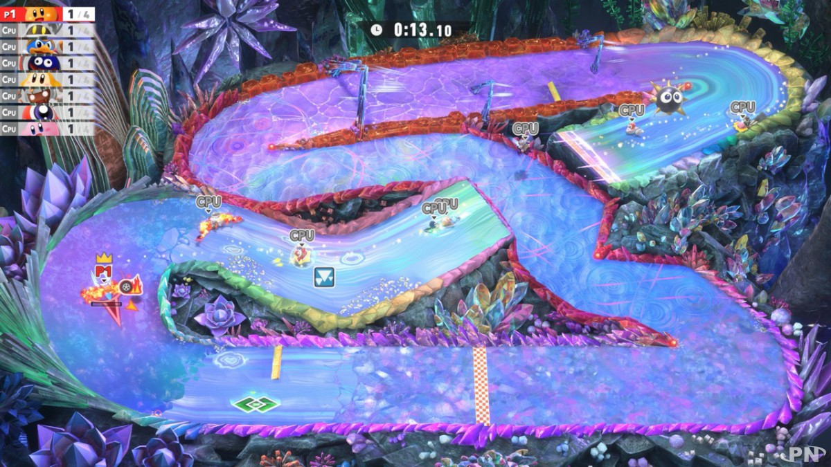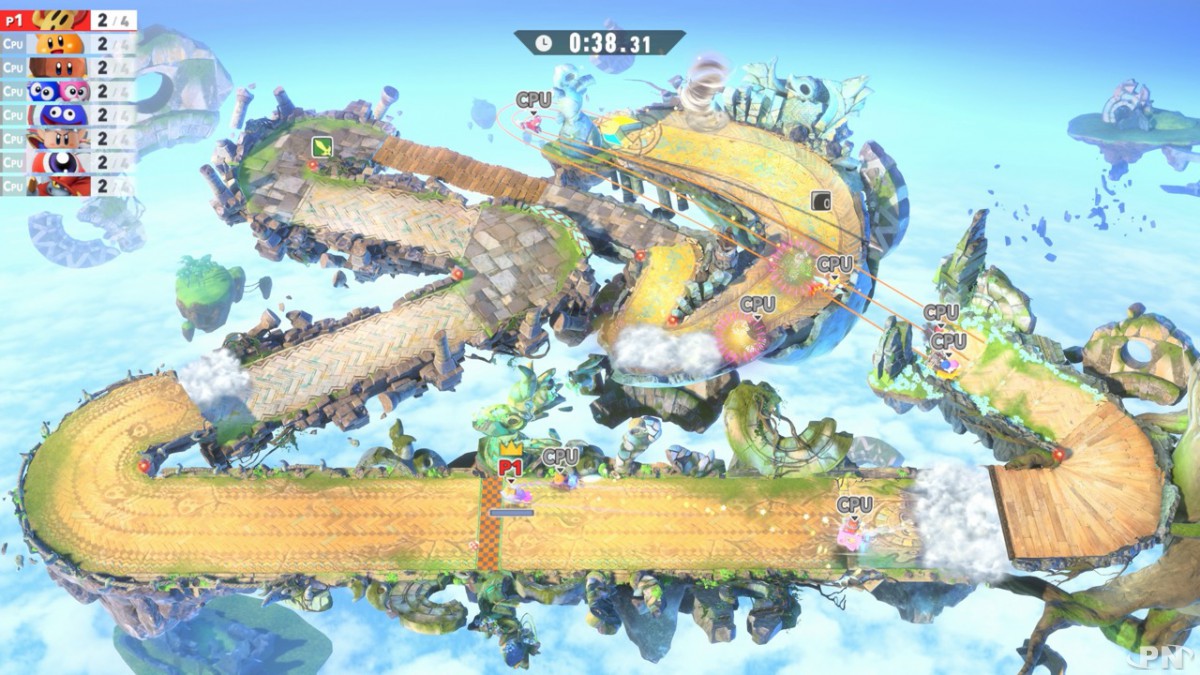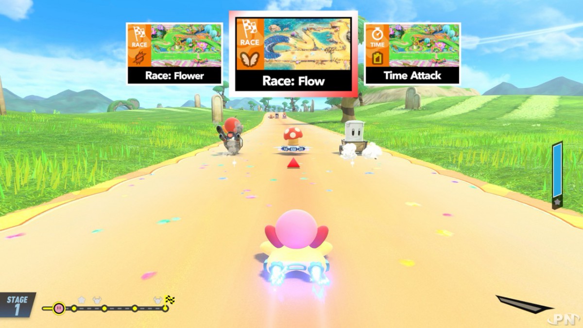 Le jeu s’annonce véritablement aussi coloré que varié, avec une succession de petits modes pour plaire au plus grand nombre. Citons ainsi les courses Multibolide qui seront disponibles dans le mode Air Ride. Au cours d’un circuit, chaque tour imposera au joueur de changer de bolide, de quoi pimenter les courses mais également de s’essayer en local au partage de la manette comme le propose Sakurai ? (qui d’autre que Nintendo peut nous inciter à échanger notre manette en pleine partie ?! On adore !)
