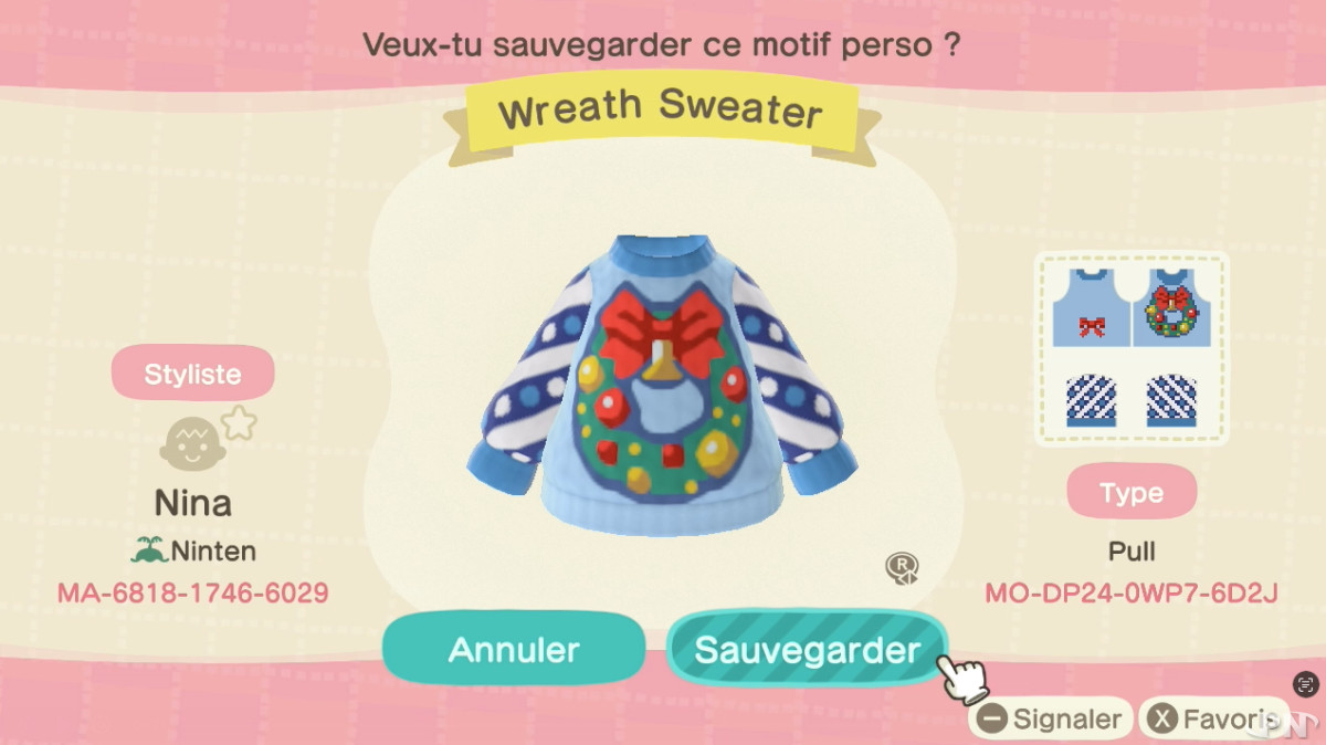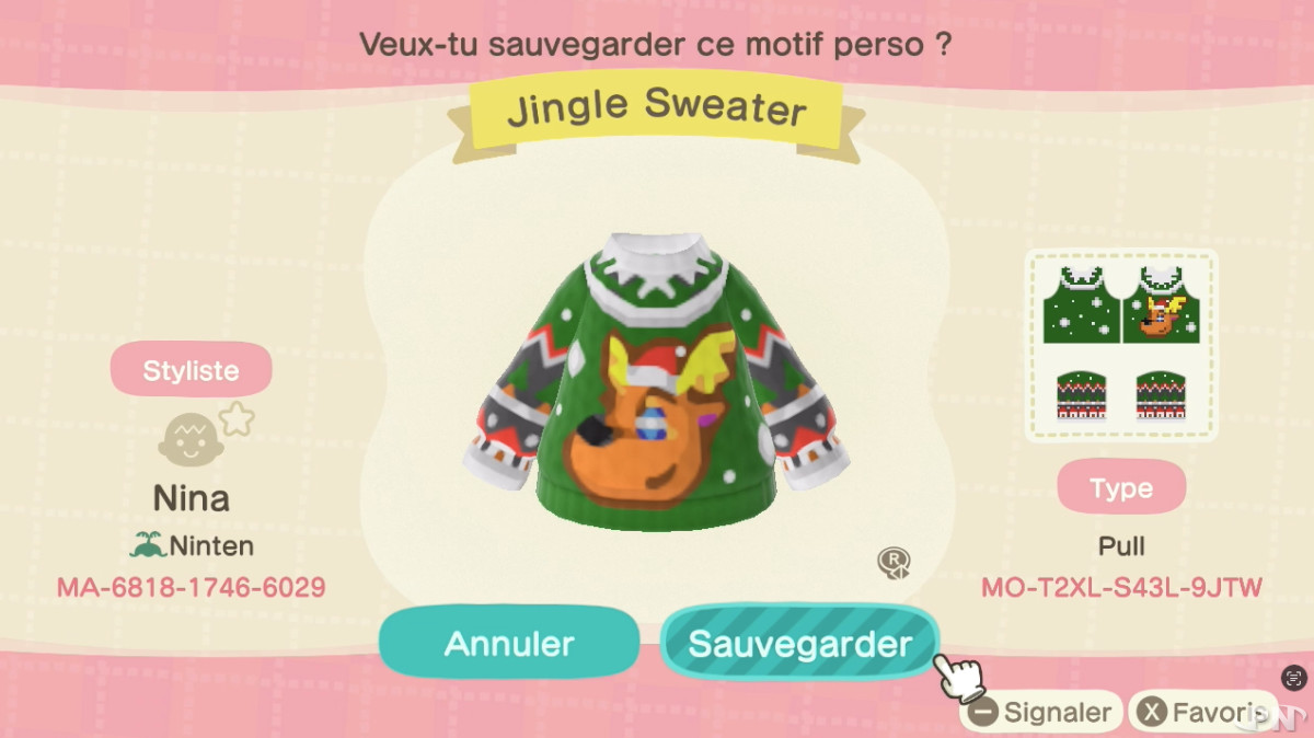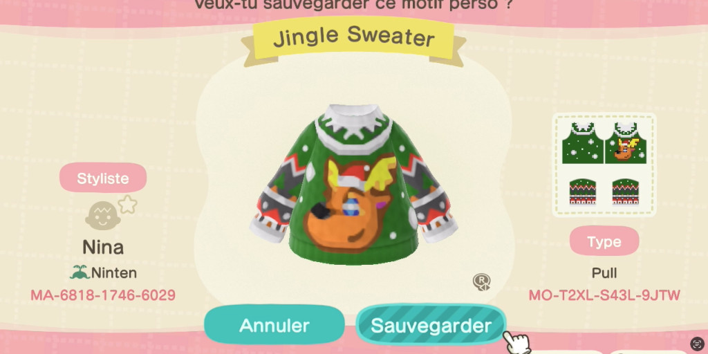 Ces pulls arborent un style de Noël un brin kitsch, parfait pour les fêtes : que vous partiez en virée photo entre amis, décoriez votre île ou célébriez l’ambiance hivernale, ils apportent une dose de bonne humeur. Vous pouvez les obtenir en vous rendant sur Ninten'Island via l’adresse onirique (en passant par votre lit et en indiquant l’adresse auprès de Serena), ou bien depuis la vitrine « Mes créations » des Sœurs Doigts de Fée, en entrant les identifiants suivants :- Pull "Jingle Sweater" : MO-T2XL-S43L-9JTW