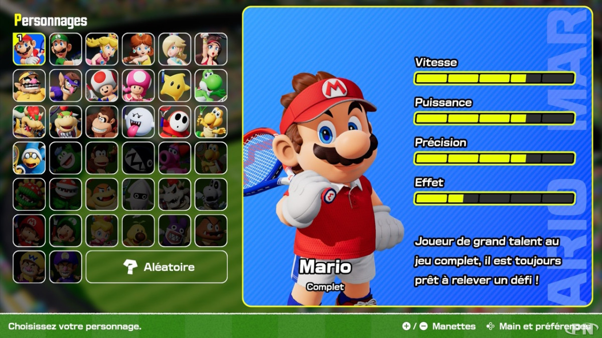 Dès votre première partie, vous pouvez compter sur 18 figures emblématiques de l’univers Mario. Chaque personnage correspond à un profil bien défini : complet, technique, ruse, vitesse, puissance ou défense. Il y aura bien un perso qui correspondra à votre style de tennis parmi ces premiers joueurs.Voici les personnages disponibles d’emblée :