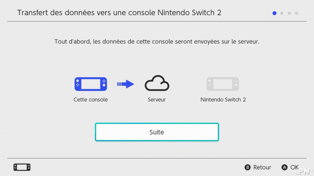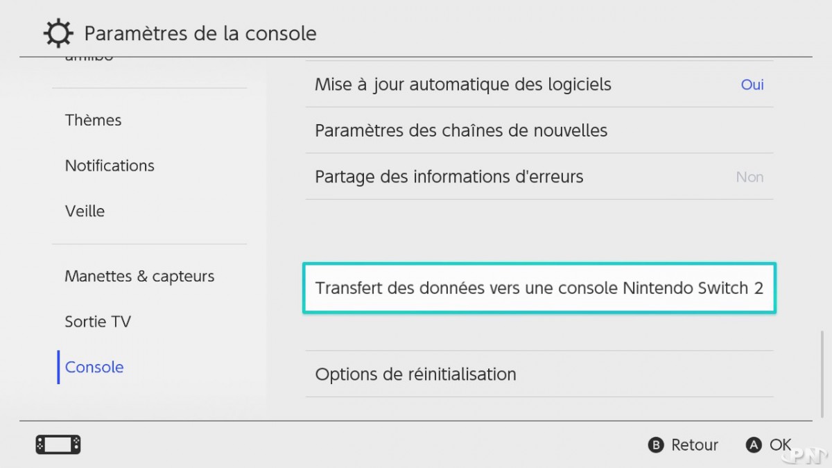 Les étapes pour réaliser le transfert de ses données d'une Switch originale vers un serveur de stockage de Nintendo, dans l'attente de l'arrivée de la Switch 2, sont simples :- Accédez au menu correspondant illustré plus haut : Accueil > Paramètres > Console > "Transfert des données vers une console Nintendo Switch 2"