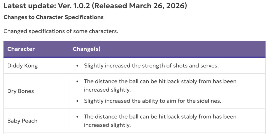 Nintendo retouche plusieurs combattants de la feuille de match. Diddy Kong gagne légèrement en puissance sur ses frappes et ses services, tandis que Skelerex, Baby Peach, Toad et Shy Guy voient leur zone de retour stable un peu augmentée.À l’inverse, Donkey Kong, La Plante Pirhana, Harmonie et Wiggler perdent légèrement en confort sur certains retours, avec aussi un démarrage de course un peu retardé pour Donkey Kong et La Plante Pirhana.