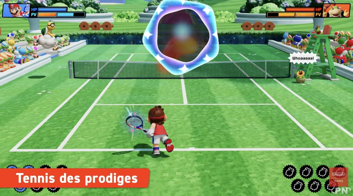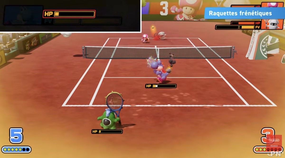 À noter également que ces frappes infligent des dégâts : si les points de vie d’un personnage tombent à zéro, celui-ci est temporairement mis hors jeu. En match en double, il est même possible de combiner les effets des raquettes frénétiques entre partenaires.