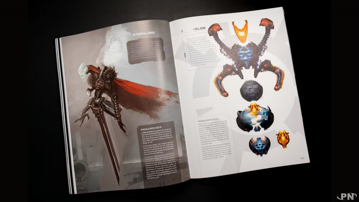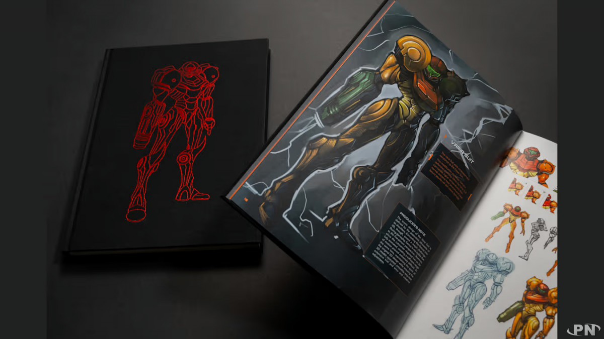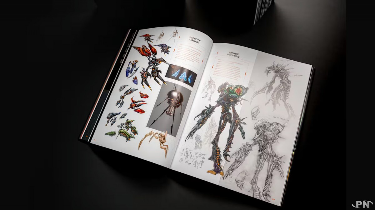 Relié dans une couverture en tissu avec une gravure métallique de Samus, ce recueil s’annonce aussi précieux à consulter qu’à exposer. Il rassemble une multitude de dessins, concepts, illustrations ainsi que des commentaires des développeurs : c'est un regard complet sur les trois épisodes principaux de la série : Metroid Prime, Metroid Prime 2: Echoes et Metroid Prime 3: Corruption.L’extrait en ligne nous montre déjà quelques superbes visuels, notamment de Samus en Phazon Suit, de Dark Samus, de Meta Ridley ou encore du terrifiant Metroid Prime lui-même.
