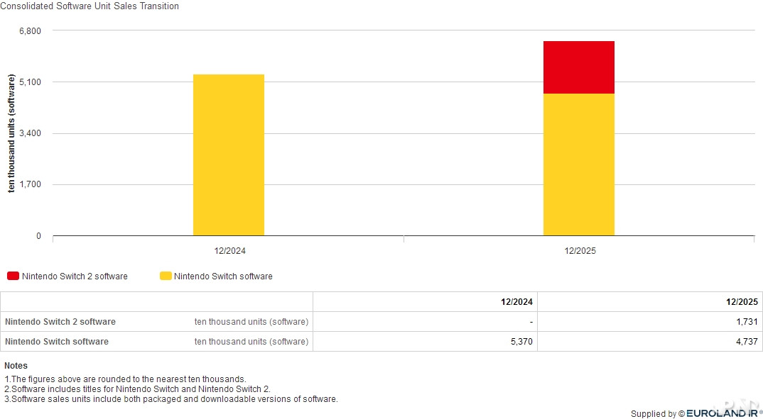 Au final, les chiffres restent stables par rapport à la même période de l'année dernière, avec même une légère augmentation grâce à l'addition des jeux Switch 1 et 2. Au total ce sont pas moins de 64,68 millions de jeux qui se sont vendus sur ce seul trimestre de Noël sur les plate-formes Nintendo, dont 17,31 millions de jeux Switch 2 et encore 47,31 millions de jeux vendus sur Switch première du nom, contre 53 millions de jeux sur la seule Switch 1 l'année dernière. De quoi rassurer Nintendo quant à l'intérêt du public pour la console de tous les records en attendant que les ventes de sa petite sœur ne s'envolent et lui permettent de prendre la relève à elle seule.