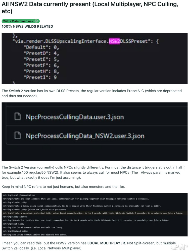 Les données repérées vont plus loin que de simples noms de plateformes. Le profil NSW2 intégrerait une gestion différente de l’affichage des PNJ et des monstres, avec une distance de rendu réduite, probablement pour préserver les performances.Autre détail intéressant : la présence d’un mode multijoueur local en réseau, pensé pour plusieurs consoles connectées sans fil. C'est une fonctionnalité qui colle parfaitement à la philosophie des consoles hybrides de Nintendo.