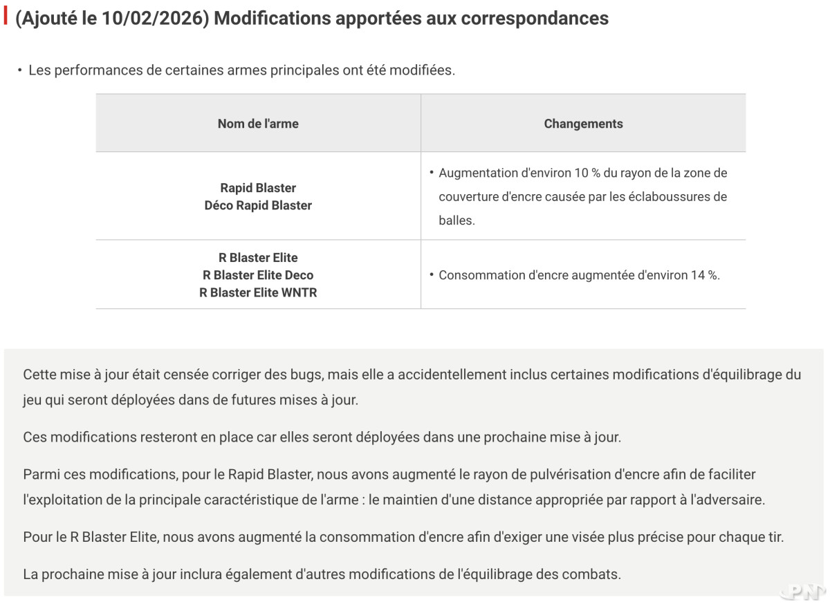 Les changements concernent plusieurs variantes de blasters. Le Rapid Blaster et le Rapid Blaster Deco bénéficient désormais d’un rayon d’encrage légèrement augmenté, d’environ 10 %, afin de mieux exploiter leur atout principal : le combat à distance intermédiaire. À l’inverse, le R Blaster Elite, ses déclinaisons Deco et WNTR voient leur consommation d’encre augmentée d’environ 14 %, ce qui impose une gestion plus prudente de chaque tir pour ne pas cramer toute sa réserve d'encre.Selon Nintendo, ces ajustements visent à affiner l’équilibre global des combats. Pour le Rapid Blaster, l’objectif est de faciliter le contrôle de la distance face aux adversaires. Pour le R Blaster Elite, l’augmentation du coût en encre doit encourager une visée plus précise et limiter les tirs excessifs.