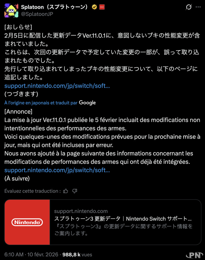 Toujours disponible sur Nintendo Switch mais jouable sur Switch 2 sans problème, Nintendo poursuit le suivi régulier de son jeu de tir, alternant correctifs techniques et ajustements de gameplay, parfois à l'insu de son plein gré comme on le voit ici.Après une version 11.0.0 déjà bien fournie, cette mise à jour 11.0.1 montre que même les patchs mineurs peuvent parfois réserver quelques surprises. Reste à voir comment la communauté compétitive s’adaptera à ces changements anticipés, et quelles autres retouches Nintendo prépare pour les prochaines batailles d’encre. Une chose est sûre : de nouvelles mises à jour sont dans les tuyaux et on ne manquera pas de les suivre ici, et ce d'autant plus que désormais, les notes de version principales sont publiées en français par Nintendo of Europe.