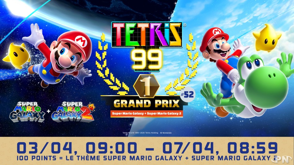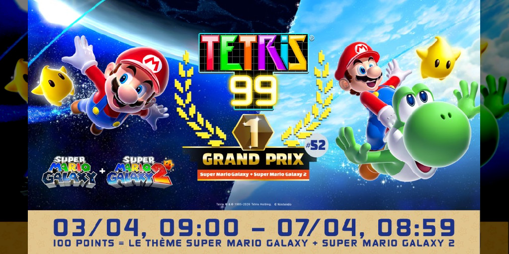 Nintendo enchaîne les événements autour de Super Mario Galaxy et cette fois, c'est Tetris 99 qui est à la fête avec l’annonce d’un nouveau Grand Prix qui devrait parler aux fans de Super Mario Galaxy. Baptisé "Grand Prix 52", cet événement temporaire proposera un thème inédit directement inspiré des deux épisodes sortis sur Wii.