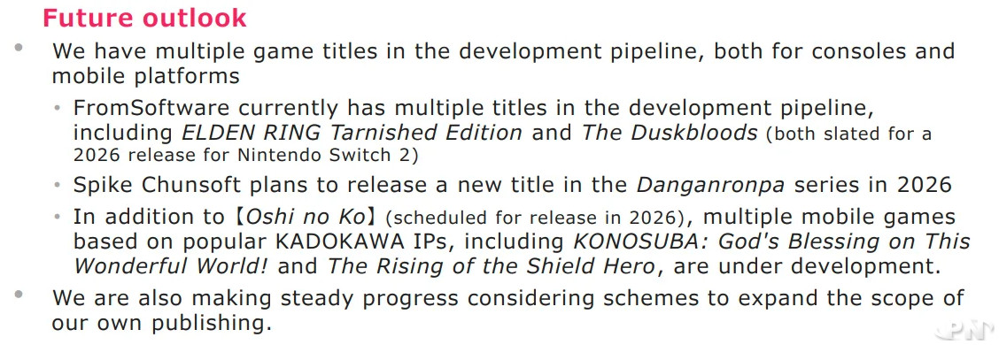 Dans ses résultats trimestriels, Kadokawa confirme que The Duskbloods figure toujours dans le calendrier de sorties 2026, aux côtés de Elden Ring: Tarnished Edition. Si aucune date plus précise n’est avancée (on imagine que ce sera à Nintendo d'avoir le privilège de dévoiler cette date de sortie), le maintien de la fenêtre 2026 rassure les joueurs qui craignaient le moindre report.Le bilan de Kadokawa rappelle en effet que The Duskbloods sera commercialisé en collaboration avec Nintendo, avec une répartition des responsabilités de vente selon les régions. ce détail compte : il confirme le positionnement du jeu comme une pure exclusivité Switch 2, et ils ne sont pas si nombreux pour qu'on ait envie de souligner ce choix stratégique qui renforcera le catalogue AAA de la machine.