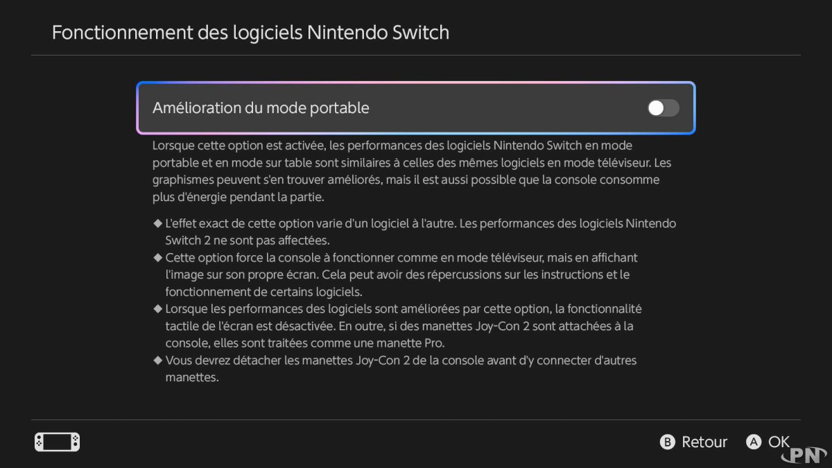 A noter que cette option désactive l'écran tactile et rend les Joy-con 2 en mode dégradé ce qui est bien regrettable.