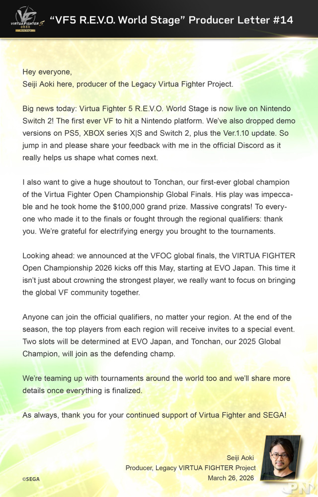 Virtua Fighter 5 R.E.V.O. World Stage est désormais disponible sur Nintendo Switch 2, une première pour la série sur une plateforme Nintendo. On a aussi mis en ligne des démos sur PS5, Xbox Series X|S et Switch 2, ainsi que la mise à jour Ver.1.10. N'hésitez pas à partager vos retours sur le Discord officiel, ils nous aident vraiment à définir la suite.