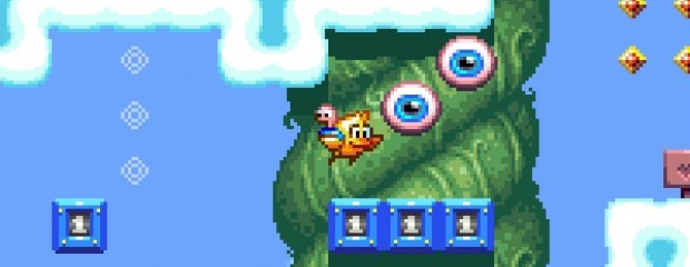 Play : on joue à l’aventure de base et on court après la sorcière qui vicieuse s’est réfugiée au sommet d’une tour en forme de haricot géant. Bon, on n’a pas rencontré Jack, mais il vous faudra vous farcir huit mondes tours, chacun étant constitué de 6 niveaux, chacun devant vous permettre de libérer de sa cage l'un de vos petits camarades à plumes.