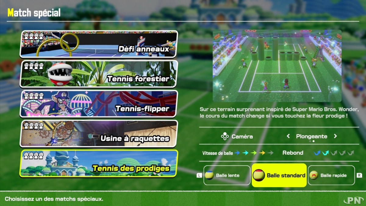 - Tennis des prodiges : inspiré de Super Mario Bros. Wonder avec le cours du match qui change si on touche la fleur prodige !