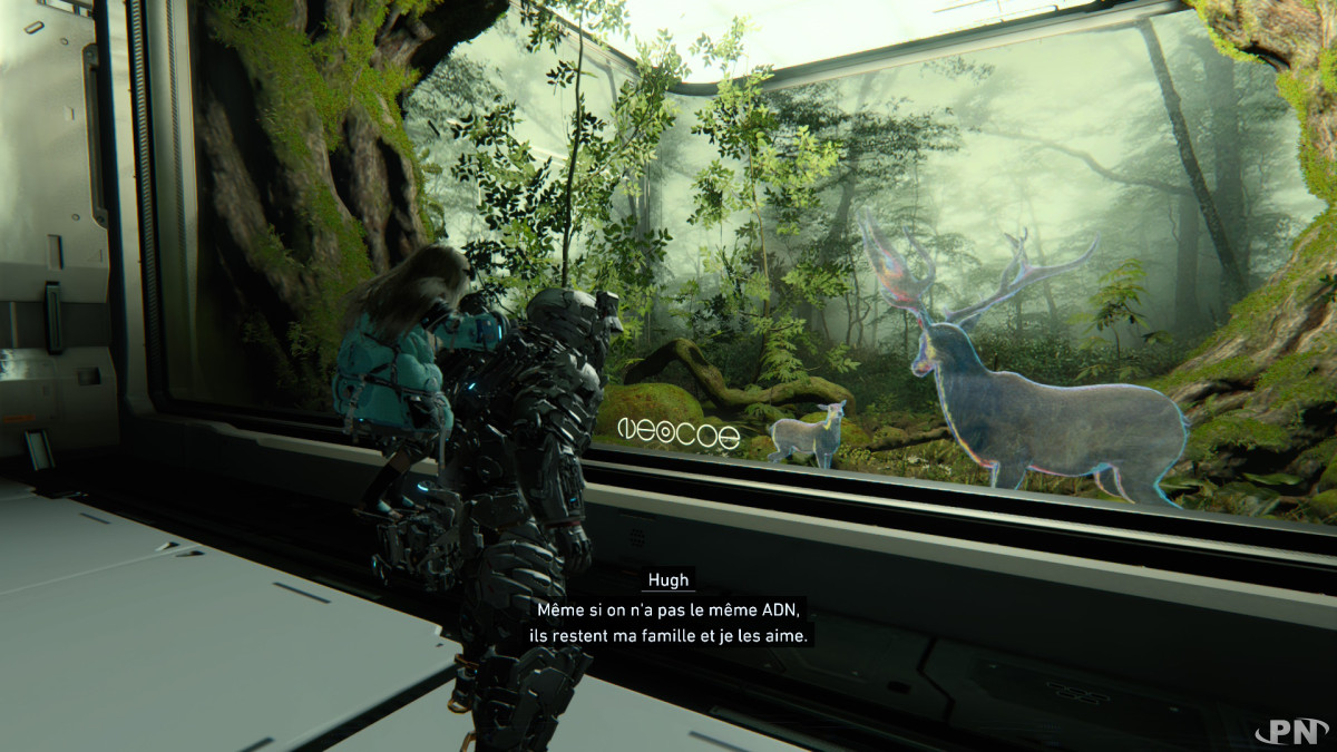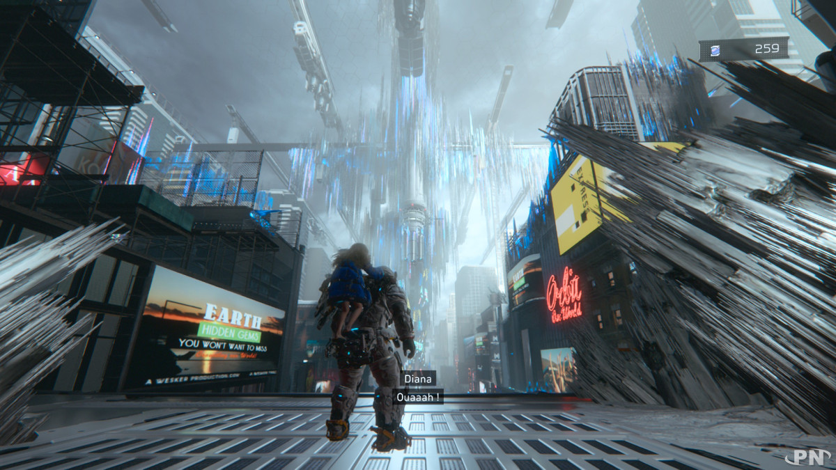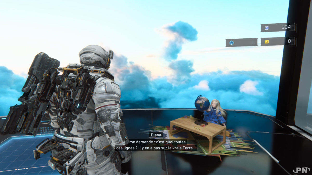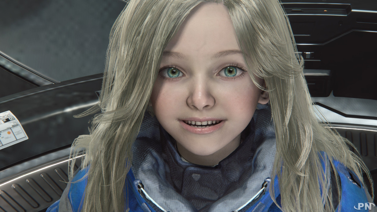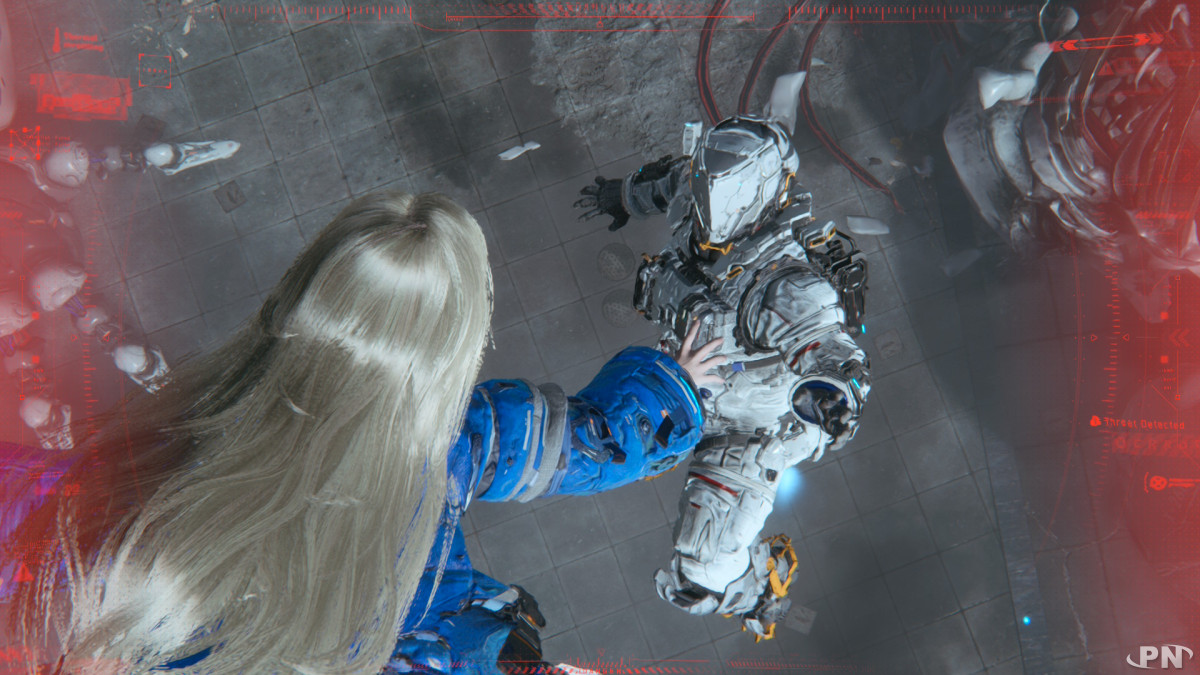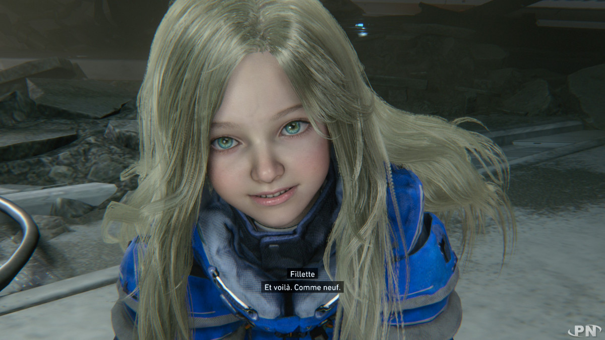 Évoqué en introduction, le scénario de Pragmata, sans être un chef-d’œuvre de science-fiction, est très satisfaisant et parfois même émouvant. Vous assistez à l’évolution de la relation entre Hugh, un quarantenaire visiblement sans enfants, et Diana, androïde reproduisant fidèlement une enfant de 8 ans qui ne connaît rien de la Terre ni des humains.Sa soif de connaissances et de découvertes pousse Hugh à s’attacher à elle, et leur relation devient le cœur du récit. Certaines quêtes secondaires, comme la collecte de « Mémoires terrestres », renforcent ce lien et apportent une légèreté bienvenue lors de vos retours au Berceau. Quelques surprises vous attendent et même si le personnage de Hugh Williams est au final très classique, c'est bien Diana qui est prête à sourire et donne au joueur l'envie d'avancer et de compléter son objectif : rejoindre la terre pour en découvrir toutes ses nuances invisibles aux yeux d'une androïde.