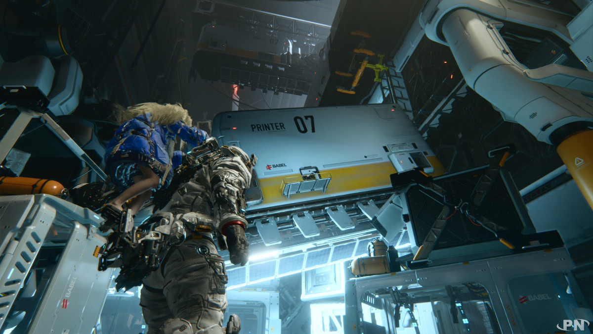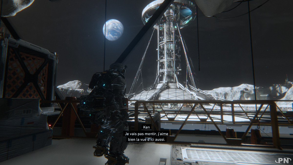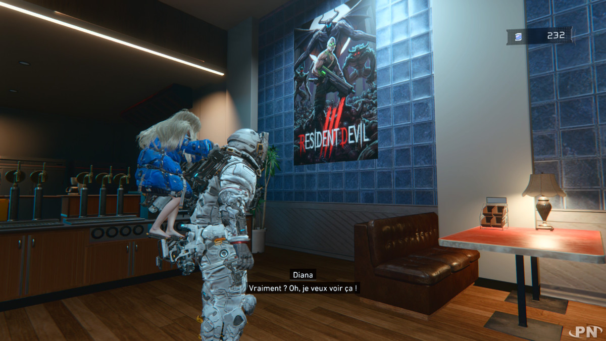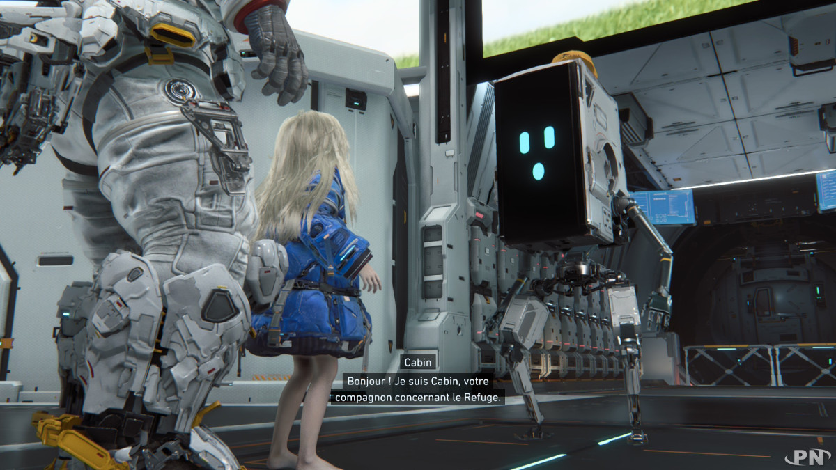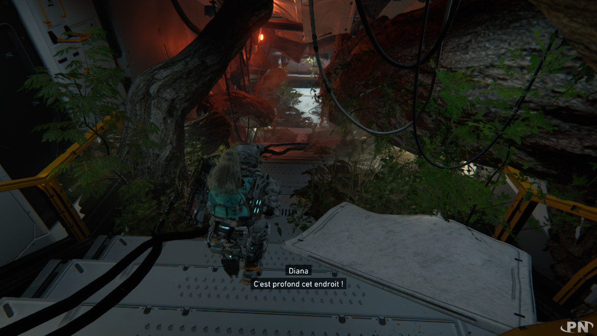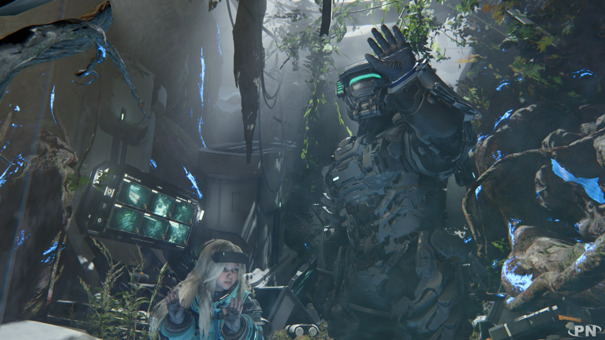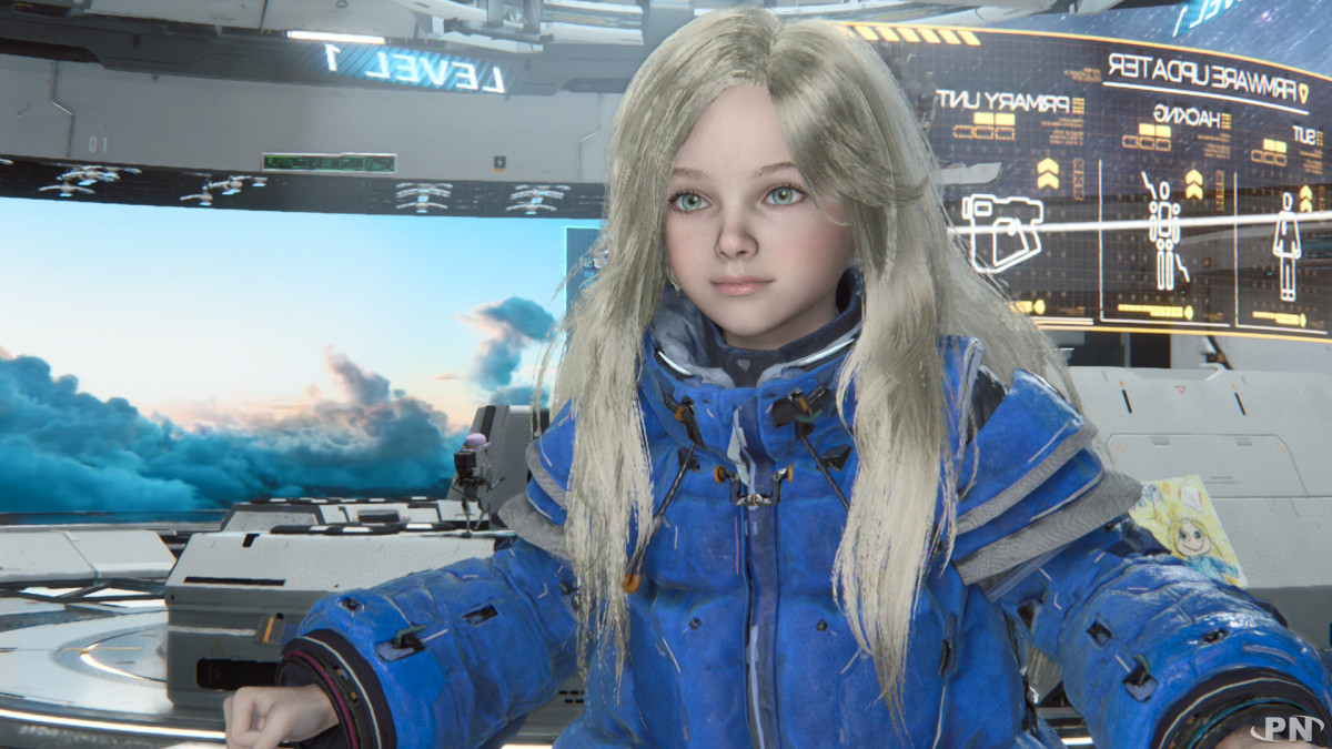 Évoqué en introduction, le scénario de Pragmata, sans être un chef-d’œuvre de science-fiction, est très satisfaisant et parfois même émouvant. Vous assistez à l’évolution de la relation entre Hugh, un quarantenaire visiblement sans enfants, et Diana, androïde reproduisant fidèlement une enfant de 8 ans qui ne connaît rien de la Terre ni des humains.Sa soif de connaissances et de découvertes pousse Hugh à s’attacher à elle, et leur relation devient le cœur du récit. Certaines quêtes secondaires, comme la collecte de « Mémoires terrestres », renforcent ce lien et apportent une légèreté bienvenue lors de vos retours au Berceau. Quelques surprises vous attendent et même si le personnage de Hugh Williams est au final très classique, c'est bien Diana qui est prête à sourire et donne au joueur l'envie d'avancer et de compléter son objectif : rejoindre la terre pour en découvrir toutes ses nuances invisibles aux yeux d'une androïde.