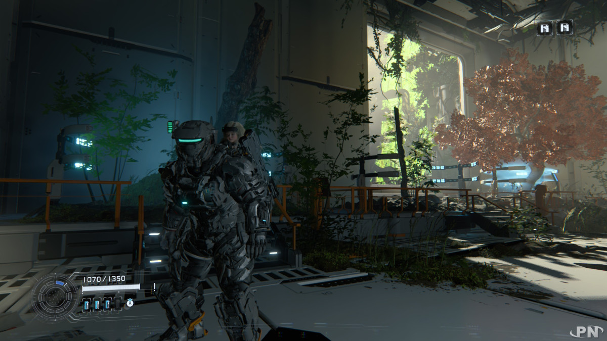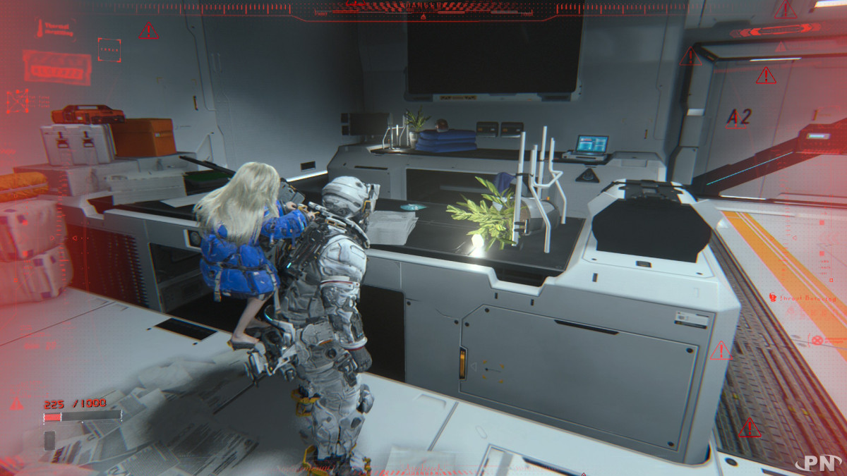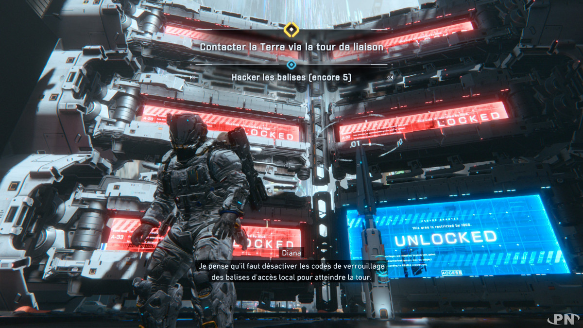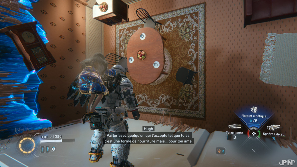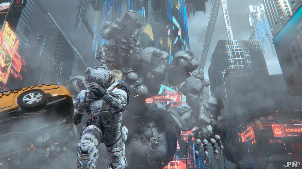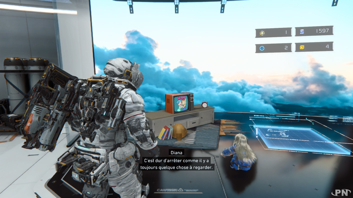 Évoqué en introduction, le scénario de Pragmata, sans être un chef-d’œuvre de science-fiction, est très satisfaisant et parfois même émouvant. Vous assistez à l’évolution de la relation entre Hugh, un quarantenaire visiblement sans enfants, et Diana, androïde reproduisant fidèlement une enfant de 8 ans qui ne connaît rien de la Terre ni des humains.Sa soif de connaissances et de découvertes pousse Hugh à s’attacher à elle, et leur relation devient le cœur du récit. Certaines quêtes secondaires, comme la collecte de « Mémoires terrestres », renforcent ce lien et apportent une légèreté bienvenue lors de vos retours au Berceau. Quelques surprises vous attendent et même si le personnage de Hugh Williams est au final très classique, c'est bien Diana qui est prête à sourire et donne au joueur l'envie d'avancer et de compléter son objectif : rejoindre la terre pour en découvrir toutes ses nuances invisibles aux yeux d'une androïde.