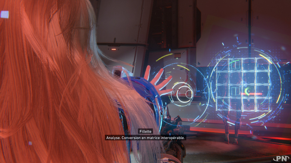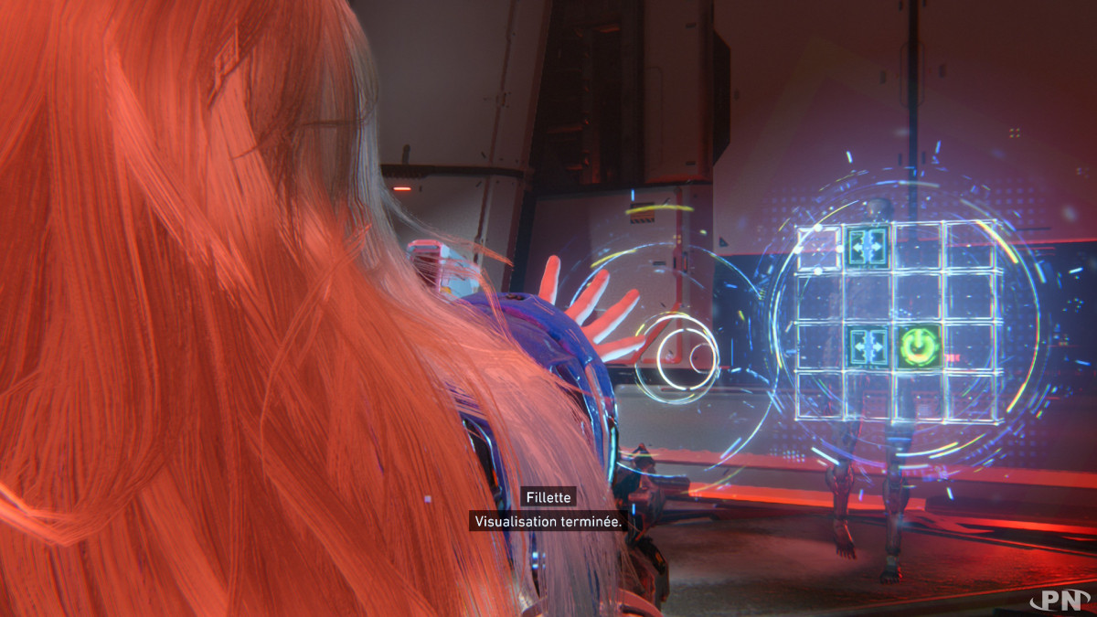 Sur le terrain, les affrontements se renouvellent constamment. Selon la zone et les situations, vous ferez face à des robots aux patterns très variés. Les ennemis les plus simples tombent rapidement, mais d’autres exigent une parfaite maîtrise de l’environnement, un usage précis de votre arsenal et une exécution rapide de vos matrices de hacking.Le rythme est soutenu, les combats nombreux et l’ensemble bien équilibré : le jeu ménage des temps de respiration entre deux affrontements, tout en distillant des éléments scénaristiques aux quatre coins du Berceau, qui permettent de mieux comprendre l’origine des Pragmata ainsi que les intentions d’IDUS et de Delphi. Ajoutez à cela la possibilité d’équiper des modules aux effets variés (attaque, défense, etc.), et vous comprenez que la situation n’est jamais vraiment bloquée : votre exploration est récompensée et votre préparation minutieuse, indispensable.
