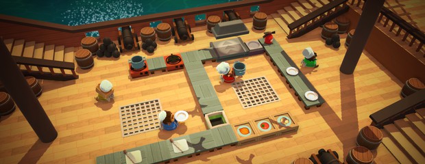 Le jeu se joue essentiellement avec 3 boutons : un pour prendre ou déposer des objets, un autre pour faire les actions types découpe ou vaisselle, et enfin un dernier pour faire une courte accélération. Cette dernière, vous permet certes d’aller plus vite, mais elle pousse également tous les joueurs qui se trouvent sur le chemin, ce qui peut avoir de grandes répercussions dans les niveaux étroits où dans ceux ou l’on peut tomber dans le vide. Il est à noter que malgré la simplicité apparente des touches, il arrive régulièrement que l’on prenne et pose des objets au mauvais endroit, un certain temps d’adaptation étant nécessaire.Un scénario improbable