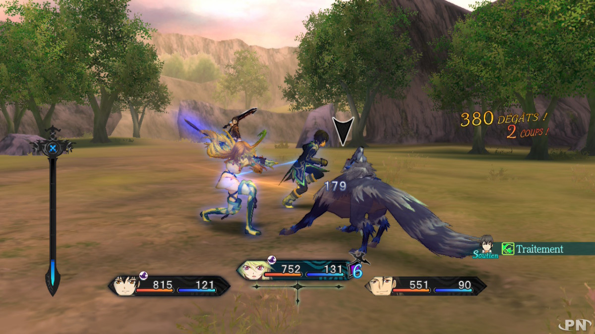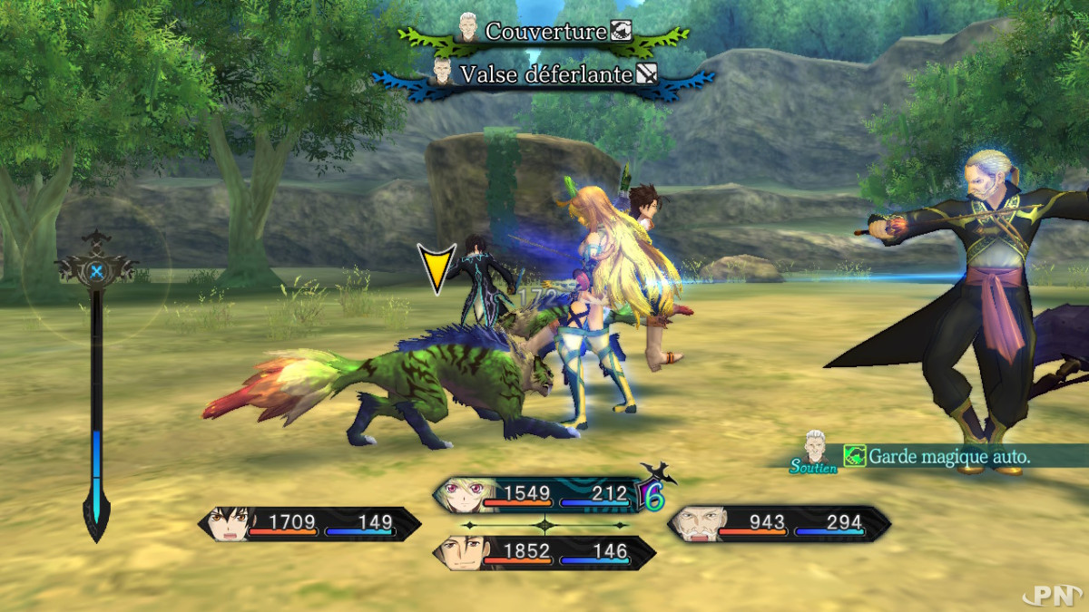 Le système de combat de Tales of Xillia a un nom : le Double Raid Linear Motion Battle System. Derrière cette suite de mots se cache un système basé sur le combat en duo. Bien entendu, vous avez toujours vos quatre combattants à l’écran. Mais vous allez vous lier à l’un d’entre eux. La jauge à gauche de l’écran se remplit au fur et à mesure et vous allez pouvoir lancer des attaques puissantes en combinant vos deux personnages. Le système de combat continue d’exploiter les possibilités offertes par les précédents opus, que ce soit les artes (les attaques puissantes qui consomment du mana) liés et autres liaisons visibles notamment dans Tales of Graces f.